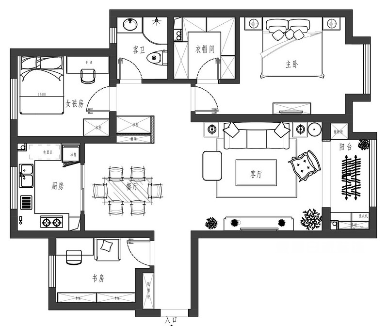 此戶型方正,南北通透,通風采光比較好,空間分隔合理,廚房門口擴大,使利用空間更大,更好的增加通風和采光,主臥的飄窗拆除,使主臥空間變大,顯得不是很擁擠,給人一個舒適的居住空間,采用用本公司香草天空的衣柜,使整個空間更加美觀,從而也增加了室內的儲物空間,也使室內更加干凈整潔。