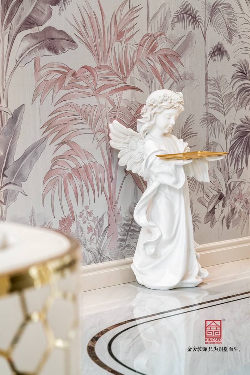 客廳整體中的配色素雅,洛可可式的造型典雅而壯觀,經典的法式壁爐,精致浪漫的大理石浮雕,體現出低調的復古奢華,歐式拱門將一幅暈染天空的畫作框入景中,做出了一種深遠而浪漫的色彩。