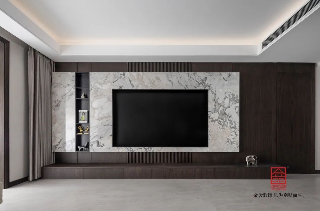深色的墻板與大理石的配合,讓兩種不同明暗的材質(zhì)在同一空間出現(xiàn)激情的碰撞,明暗蜿蜒的大理石紋理,也讓整個(gè)空間出現(xiàn)了一種流動(dòng)感。沙發(fā)背景墻采用水墨山水的背燈硬包,讓空間增加了一份東方意味。