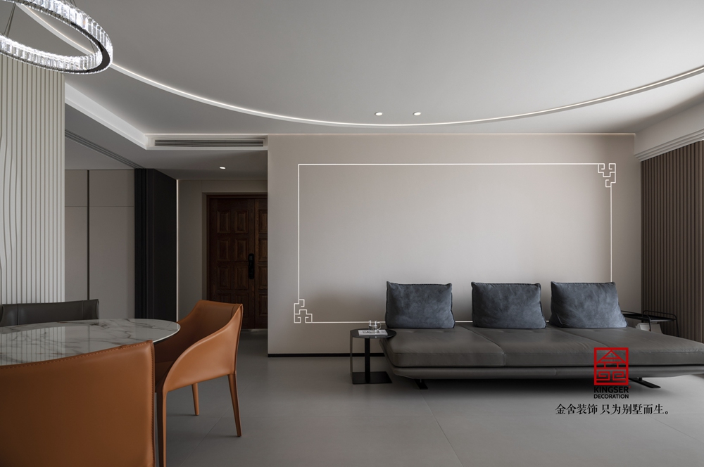 客廳空間沒有安置茶幾,這種無茶幾的設(shè)計(jì) ,讓整個(gè)空間看起來更加的寬敞,本身就是一家五口,這樣的設(shè)置,也給了孩子足夠的運(yùn)動(dòng)空間,沙發(fā)背景墻用燈條拼接而成,中式紋理的也被制作了進(jìn)去,讓整個(gè)空間充滿文化的氣息。