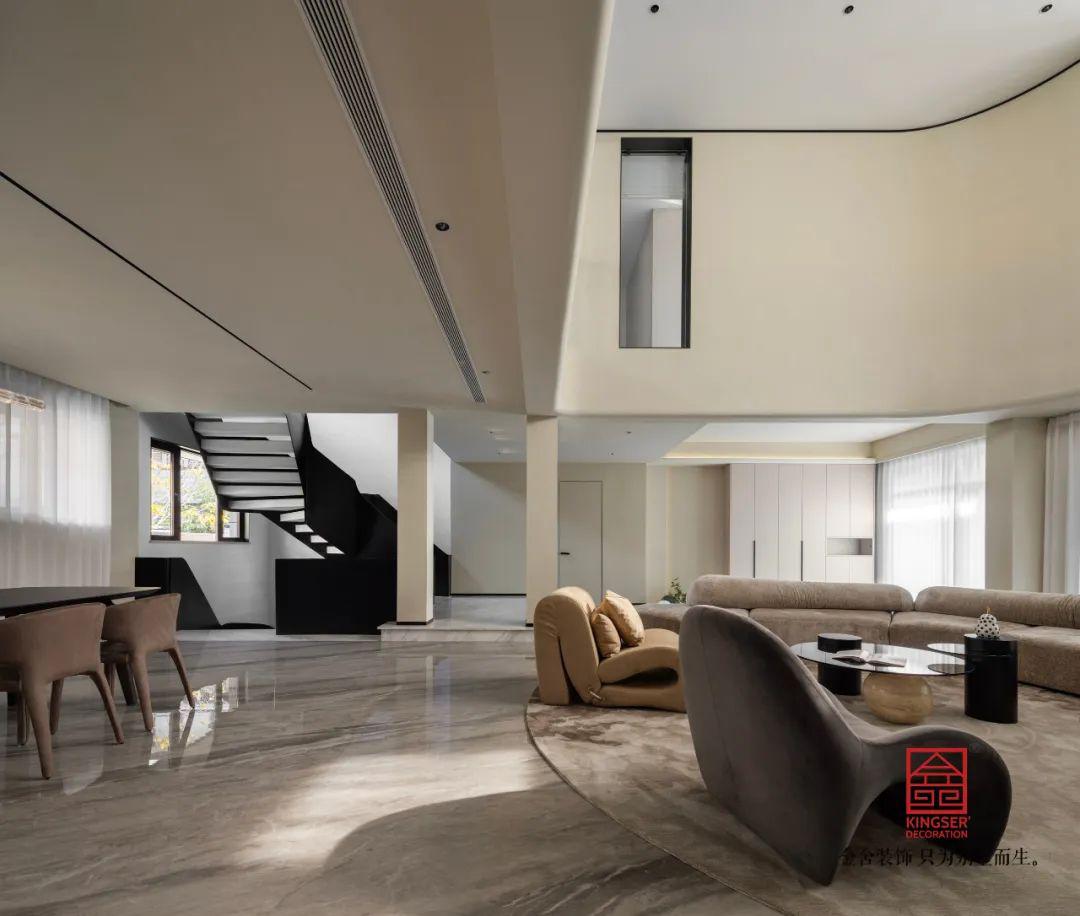 巨大的挑空空間之下,是設(shè)計(jì)師對(duì)于設(shè)計(jì)的把控,首層6米挑空客廳以鋼化玻璃幕墻打造通透感,雙層中空玻璃引入充沛自然光,半開(kāi)放的廚房、島臺(tái)吧臺(tái)與落地窗景融為一體。全屋采用暖白、卡其、米咖等低飽和色調(diào),墻面啞光質(zhì)感涂料與淺咖沙發(fā)碰撞,塑造出極具質(zhì)感的空間。