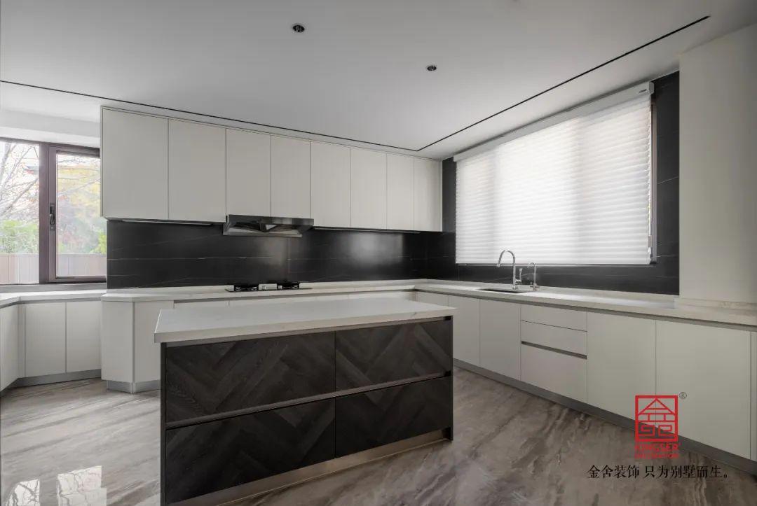 黑白配色的半開(kāi)敞式廚房,中導(dǎo)臺(tái)也置入其中,經(jīng)典的配色隨時(shí)都不會(huì)讓人感覺(jué)到厭煩,巡回式動(dòng)線合理且流暢。