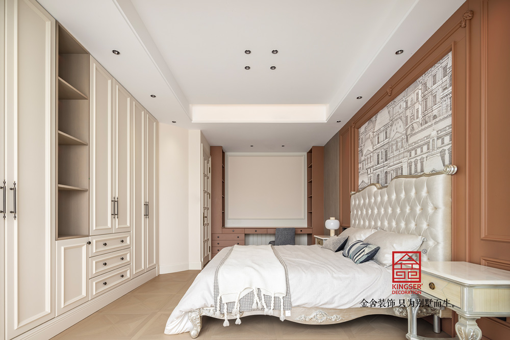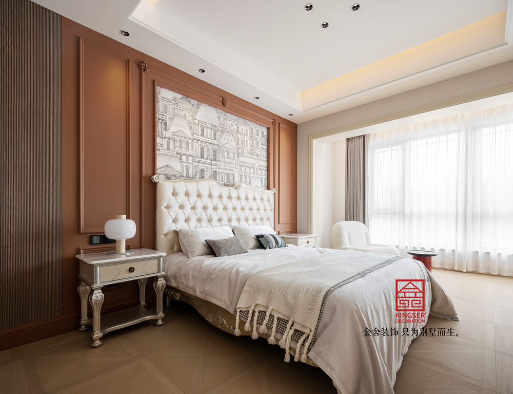 輕法式風(fēng)格的魅力在于,盡管設(shè)計元素簡約,但仍然能感受到它的精致和奢華氣息,大面積留白,綴以復(fù)古感與時尚兼具的材質(zhì)、燈具、家私,為臥室注入一絲奢華凡爾賽的浪漫。
