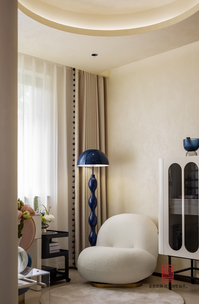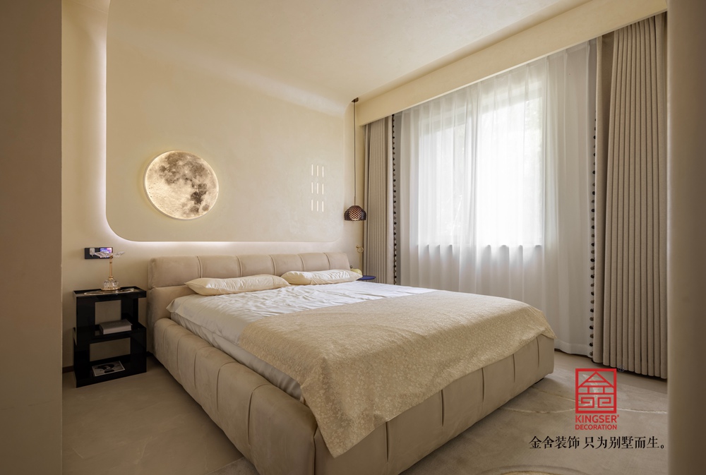 負(fù)二樓的臥室是客房,淺木家具配米白加金色床品,透著溫潤(rùn)感。飄窗邊設(shè)陽(yáng)光區(qū),擺著幾個(gè)抱枕,夜晚枕著柔和燈光,能給來(lái)客一份歸家般的安穩(wěn)。
