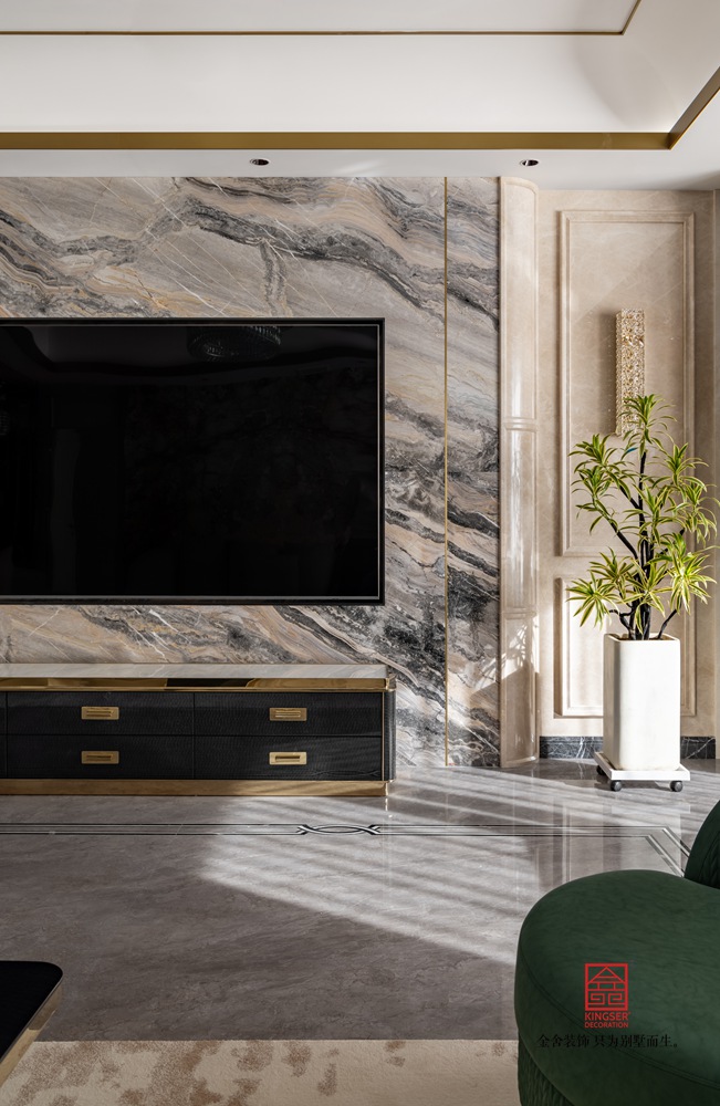 如滔滔江水傾瀉而下的石材肌理,赭石與黑色的顏色對撞,石材的堅(jiān)硬與皮制的溫潤的融合,金屬的邊緣與整體溫暖的配色,這是客戶對生活的向往,也是對美好未來的構(gòu)建。