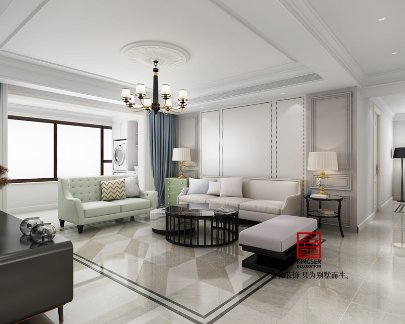 -榮盛華府185平米美式休閑風格裝修效果圖。它就猶如一個歡快的年輕人,輕快的走在田間小路上,它散發(fā)著陽光的溫暖與青草的幽香,讓人們體會到最簡單本質(zhì)的快樂。整個設計作品采用莫蘭迪色系,營造出一個清晰文藝的休閑空間。置身客廳,以米白色為基調(diào),淺米白亮色硬包雅灰色木飾面帶來舒適靜心的視覺感受,淡綠色布藝沙發(fā)與天藍色窗簾對應承接,來表現(xiàn)空間獨有的意識形態(tài)。