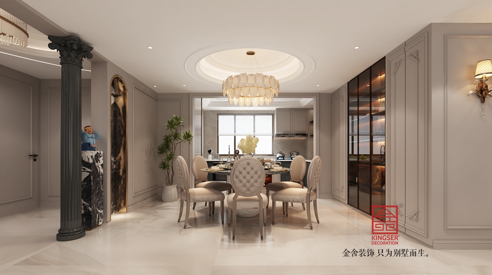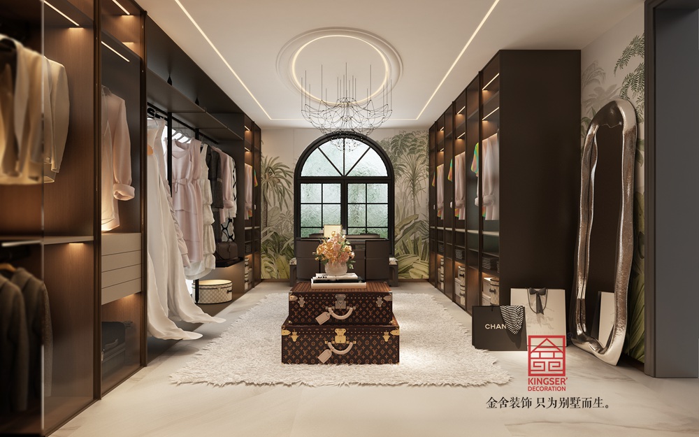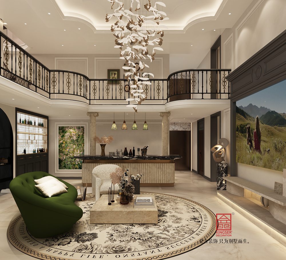 本案挑空客廳以新古典風格為基底,融合現(xiàn)代設計語言。運用經(jīng)典的石膏線、護墻板勾勒空間秩序,搭配簡約造型的家具與藝術吊燈,既保留古典的優(yōu)雅韻味,又注入當代的時尚與靈動,實現(xiàn)傳統(tǒng)與現(xiàn)代的對話。