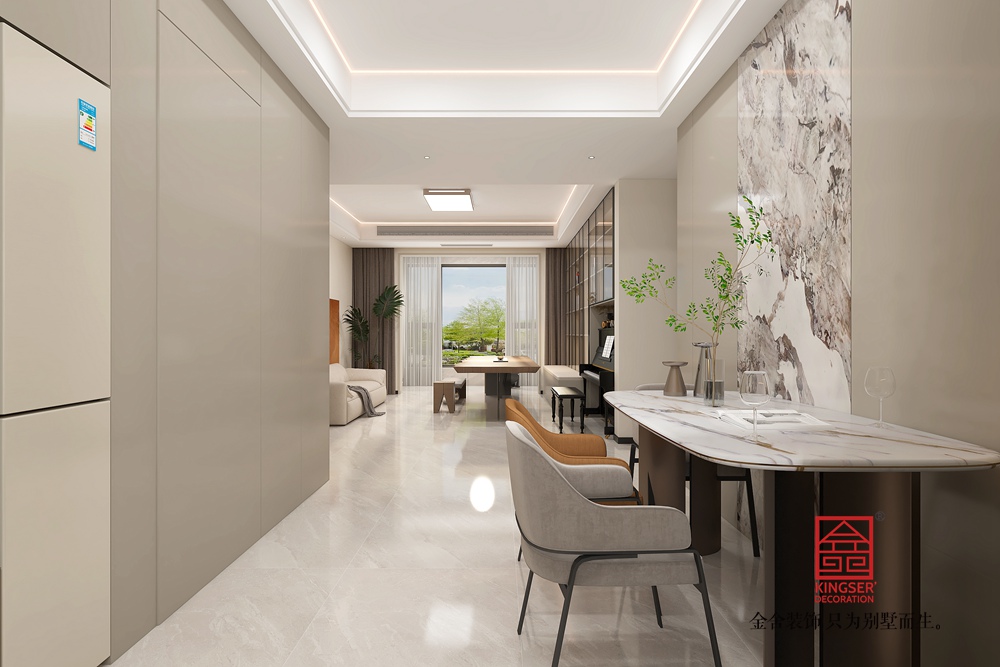 材質(zhì)上,原木的自然質(zhì)感、大理石的光潔以及金屬的精致相互融合,層次豐富。燈光設(shè)計(jì)巧妙,嵌入式燈帶與頂燈營造出柔和均勻的光照,凸顯空間通透感。整體設(shè)計(jì)摒棄傳統(tǒng)客廳的刻板,以實(shí)用與美學(xué)兼具的布局,為居者帶來更具個性與深度的生活體驗(yàn),詮釋了去客廳化設(shè)計(jì)對生活方式的創(chuàng)新與升級。