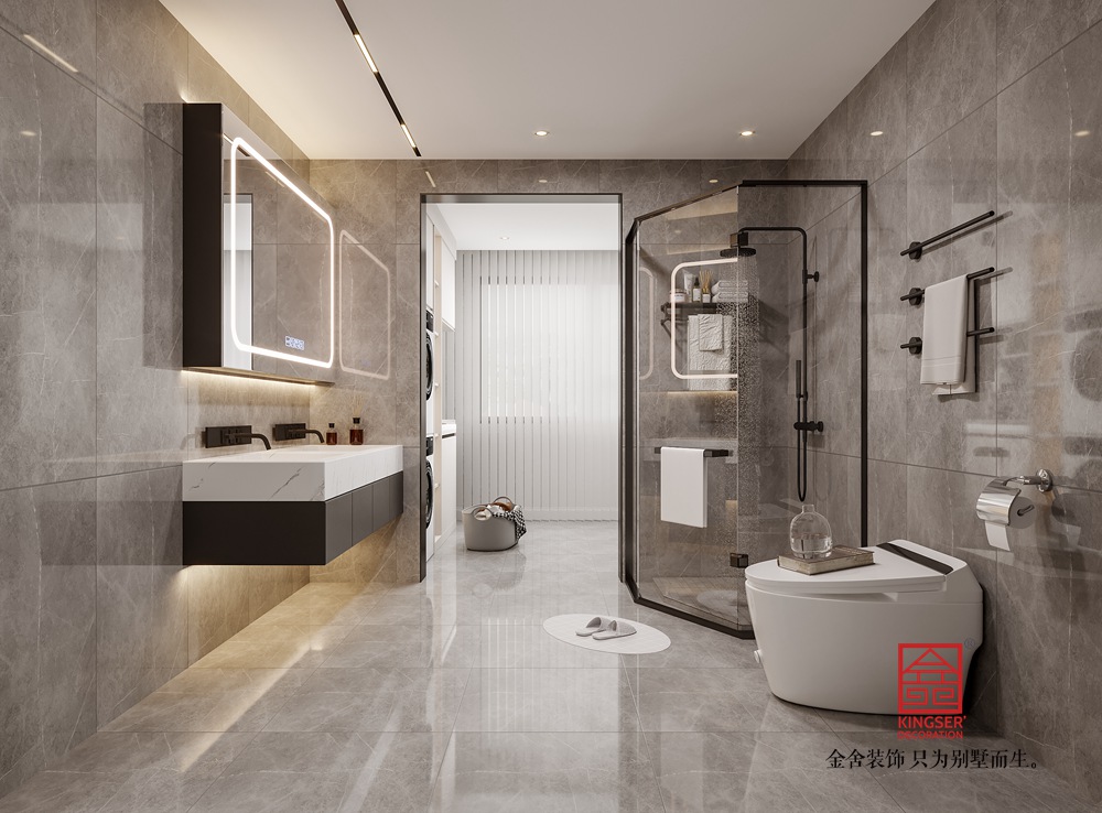 該別墅客廳設(shè)計(jì)遵循現(xiàn)代輕奢與極簡(jiǎn)融合的思路。整體色調(diào)選取低飽和度的暖棕、米白等,構(gòu)建出雅致柔和的基底。大面積的墻面采用簡(jiǎn)潔的板材設(shè)計(jì),干凈利落,與嵌入其中的電視及兩側(cè)帶有燈光點(diǎn)綴的收納格相配合,既滿足實(shí)用需求,又通過(guò)光影變化營(yíng)造出輕奢氛圍。