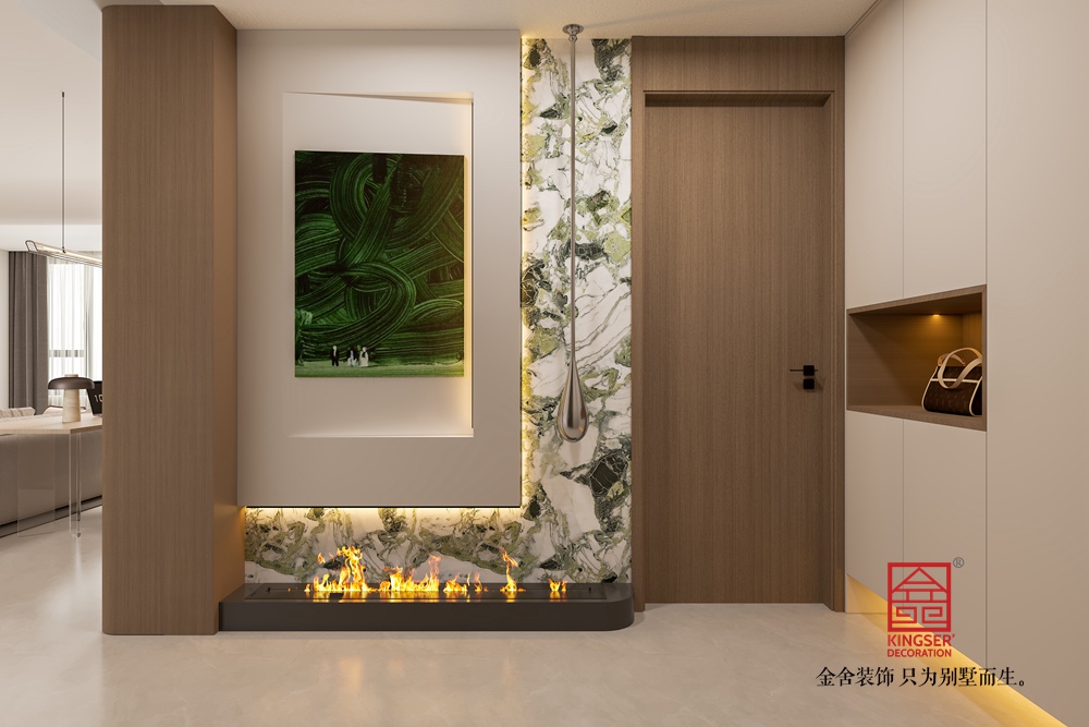 本客廳設(shè)計(jì)以現(xiàn)代簡約風(fēng)格為核心,主打溫暖柔和的大地色系??臻g布局上,將休閑與功能區(qū)巧妙融合,背景墻處的柜體設(shè)計(jì),兼具收納與展示功能,燈光點(diǎn)綴更顯精致。家具選擇注重舒適與質(zhì)感,淺米色大沙發(fā)搭配棕色系單品,營造出溫馨和諧的氛圍。雙層環(huán)形吊燈造型別致,為空間增添時(shí)尚感。整體通過材質(zhì)、色彩與燈光的搭配,打造出一個(gè)舒適、雅致且充滿生活氣息的別墅起居空間。