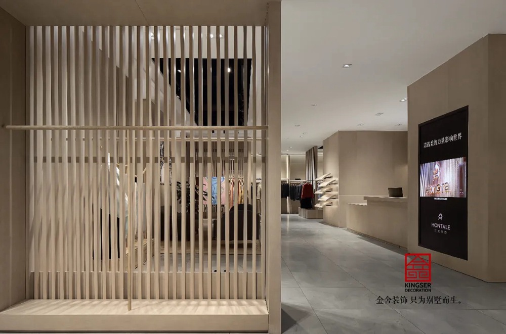 休息區(qū)的風(fēng)格與整體風(fēng)格一致,復(fù)古的木柵格讓店內(nèi)的展示衣物若隱若現(xiàn),讓處于休息區(qū)的客戶也能觀賞到店內(nèi)主推的產(chǎn)品。
