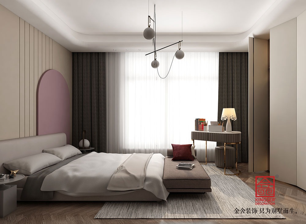 主人喜喝茶、對(duì)影音方面有需求、社交圈廣、對(duì)客餐廳和廚房要求極高,設(shè)計(jì)師進(jìn)行了適當(dāng)?shù)膲w拆除,利用梁去做造型,去強(qiáng)化、體現(xiàn)空間感。客廳利用柱子做了一個(gè)東西向的書(shū)柜,具備一定的空間實(shí)用性。加入透光玻璃使其增加采光面,把人造光打造成自然光的感覺(jué),以達(dá)到光的營(yíng)造目的。電視墻的處理手法是把實(shí)墻的底部設(shè)計(jì)懸空感,讓實(shí)墻變成裝置、底部下面放石頭,石頭與不銹鋼飾面和反弧度造型有很好的銜接。頂面直接用雙層弧面頂、上下弧形完美銜接,給人一種輕盈感。投影與書(shū)房的銜接,燈光是周圈燈光,光感也會(huì)框定化、面也會(huì)最大化,形成等面。留白不空,留白不白,濃淡得宜,猶如山水畫(huà)般更能予人無(wú)限想象的空間。廚房整體的構(gòu)造是開(kāi)放式設(shè)計(jì),不僅具有較強(qiáng)的流動(dòng)性和自由性,同時(shí)有保持空間的功能合理性打造更加人性化的烹飪環(huán)境。臥室是人在家中憩息的港灣,倦鳥(niǎo)歸,整體營(yíng)造的沉穩(wěn)、安靜、高端的風(fēng),使視覺(jué)以及精神感知方面得到雙重享受。